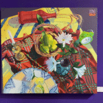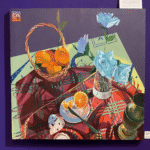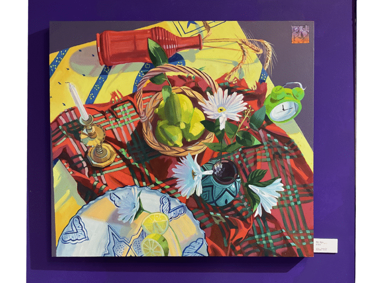 Paintings of antique Moroccan utensils and embroidered fabrics. These works revive the cultural symbolism of family gatherings and the preservation of tradition